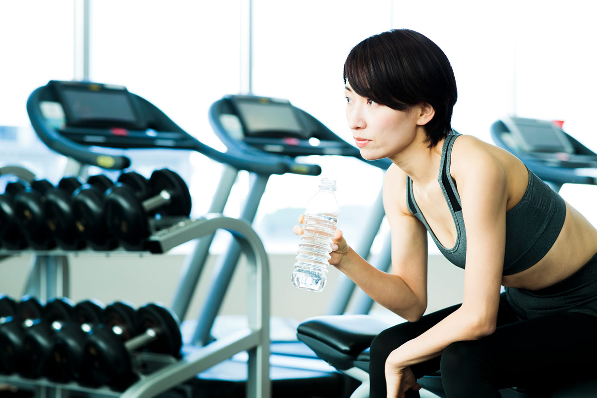 運動前後だけでなく、トレーニング中もこまめな水分補給を意識しましょう。空腹状態での筋トレも避けることが望ましいです。